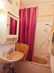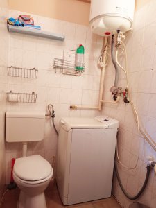 A kádas fürdőszobában kapott helyet a WC, valamint a mosógép. A melegvizet éjjel-nappali áramra kötött 80 literes villanybojler szolgáltatja.