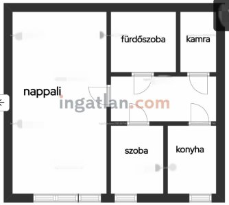 A fém bejárati ajtón belépve a lakás elosztása a következő: a bejárattól jobbra tárolóhelyiség és fürdőszoba, balra a boltíves bejáratú konyha és a kisszoba, a bejárattal szemben pedig a nagyszoba található.