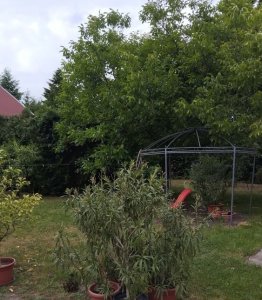 Az udvarban két különálló melléképület, garázs és egy kis szerszámtároló is van. A telken gyümölcsfák, bokrok, szőlőlugas, virágok és árnyas kiülő is helyet kapott. A locsolás fúrt kútról megoldható.